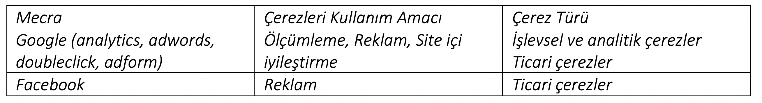 İnternet sitemizde yer alan çerezlere ilişkin bilgiler aşağıdaki tablolarda yer almaktadır: